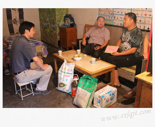 来到秦鹏家,侯晚生副总亲切询问秦鹏家里的情况。秦鹏妻子没有工作,孩子正上小学,全家人都靠他一个人的工资支撑,生活很拮据;而且多年来一直没有住房,居无定所,现在居住的斜口库房两间平房还是公司给协调的;去年妻子又做了心脏支架手术,给这个并不富裕的家庭增加了沉重的负担。候总开导他,只要勤奋努力,生活就会有转机,一定要有勇气面对困难,公司也会一直给予帮助和照顾。结合目前公司经营情况,侯总建议秦鹏考虑去国外项目工作,还介绍了国外项目有关用工政策及工资待遇,并安排办公室协助其办理护照等出国手续。秦鹏听了以后非常感动,他表示一定要珍惜工作机会,努力把活干好,走出困境,不给公司增添麻烦。临走时,侯总还把自己的手机号码留给秦鹏,让他有什么困难直接联系。侯总还给秦鹏一家带来了慰问金和米、面、油等日常生活用品。