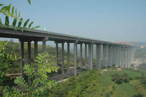 本合同段位于河南省济源市王屋山中,全长2.95公里,路线设计等级为山岭重丘区高速公路,工程内容主要包括逢石河特大桥以及涵洞通道、路基土石方、防护排水工程等,其中逢石河特大桥长1419.0m,主桥上部结构采用预应力砼连续刚构,最大跨径120m,引桥采用40m先简支后连续箱梁,主桥下部采用矩形空心簿壁墩,最高墩为101m,合同金额23356万元,施工时间为2006年1月至2008年10月。该桥具有“高、大、难”等特点,具有“中原第一高”之称,施工中采用了许多新技术、新工艺,项目部QC课题获得全国交通行业优秀QC小组成果一等奖。