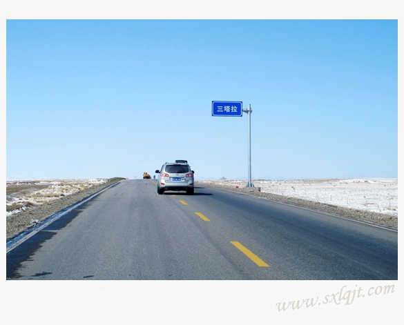 汽车在共玉原有的三级公路上疾驰,途中翻越了几座大山,但大部分的路途还是在平原上行进。在平原上行进时,感觉这条路的路基比内地普通公路低了很多,好像它是贴着地皮在走,而且路又是那样的直,那样的平,路的尽头好像是通向了天际,连着五彩云天,让人视野开阔,心情舒畅,非常具有西部高原的特色。车辆经过“一塔拉”、“二塔拉”、“三塔拉”时,别有一番兴味和感受。